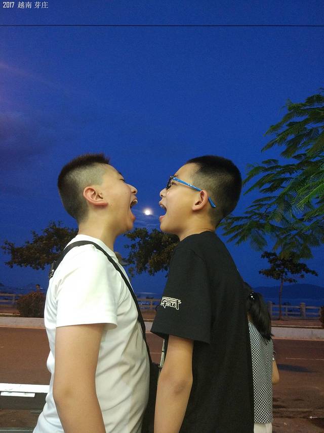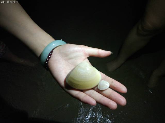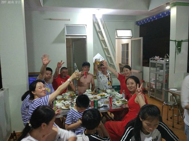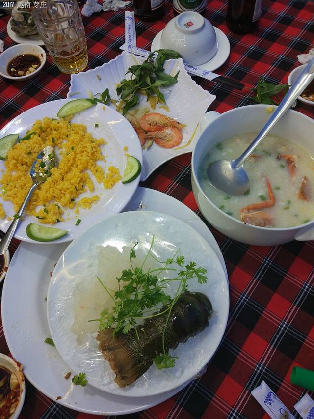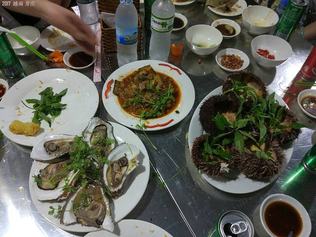 晚饭是自行解决的,大家商量了一下,决定找一家吃海鲜的地方。考虑到越南人对当地人和中国人实行两个收费标准,怕被坑了,就找了导游。结果,导游的姐姐就在五指岩附近开了一家餐馆叫“四海一家”。出于对国人的信任,我们就去了。不巧的是,正值农历十五,当地渔民不出海,所以海鲜有限,皮皮虾也没有。不过也无所谓了,一般的食材还是有的,点了几瓶啤酒,趁着美丽的月色,享受一顿异国风情的晚餐吧!吃完后一结账,两家六个人消费200万,折合人民币600元,人均100元,还算便宜!