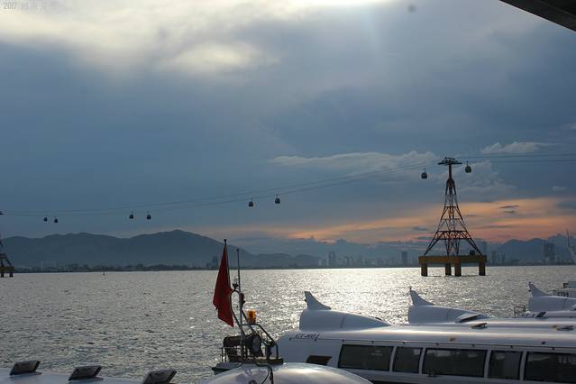 快艇抵达岛上的码头,夕阳下的跨海缆车!