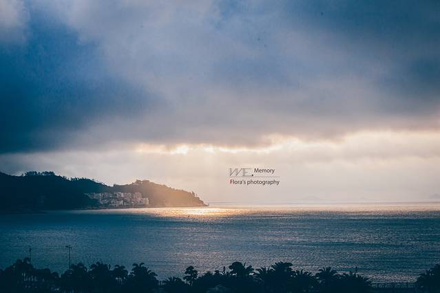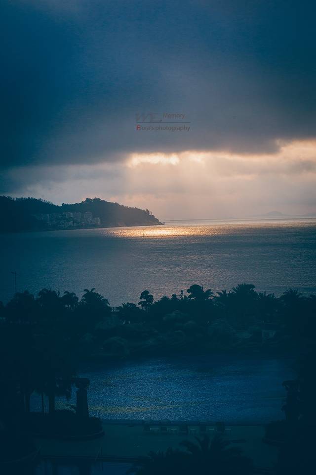 第二天清晨醒来推开露台的门,远处海面上初升的太阳在云层后面投射出一束束的光线,将远处的海面圈出一片金色的光芒。