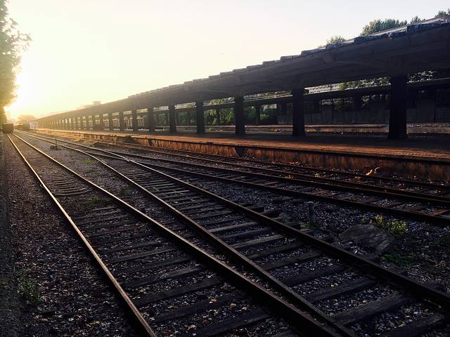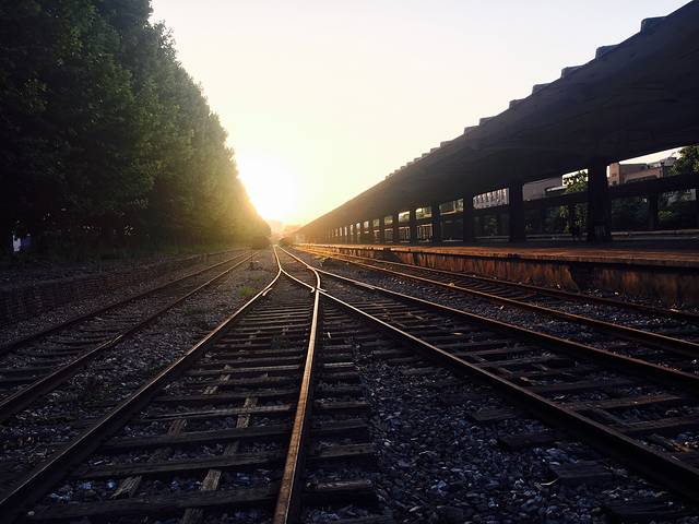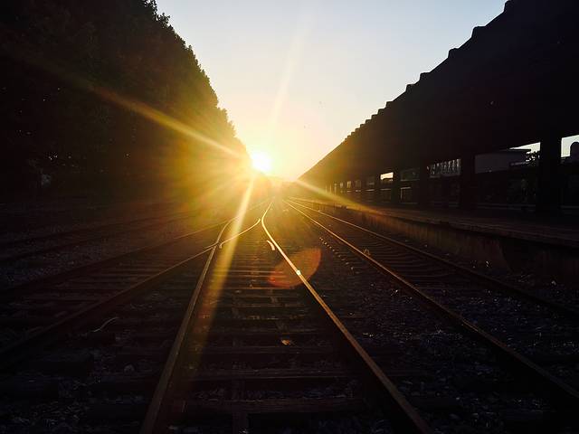 看着落在被杂草包围着的铁轨上的夕阳🌇
