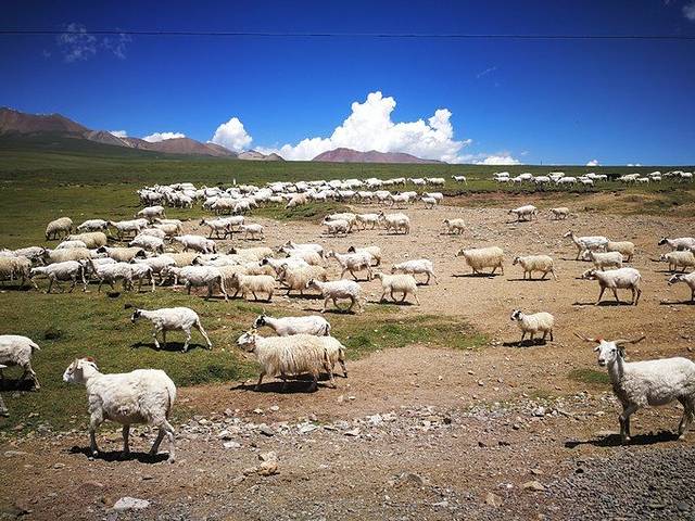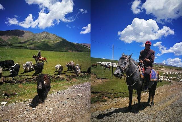 在去往下个景点,海拔4120的大冬树山垭口的路上,赶上了一次大面积的动物迁徙,每年的七月份左右牧民都会将自家的羊以及耗牛由山下赶往山上,吃顶上的草,待九十月份的时候,再将其赶往至山下,这样在风雪将山顶覆盖后,牛羊还是会有山下的草可以吃,于是我有幸真正的体验到了一把,什么是风吹草地见牛羊!