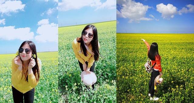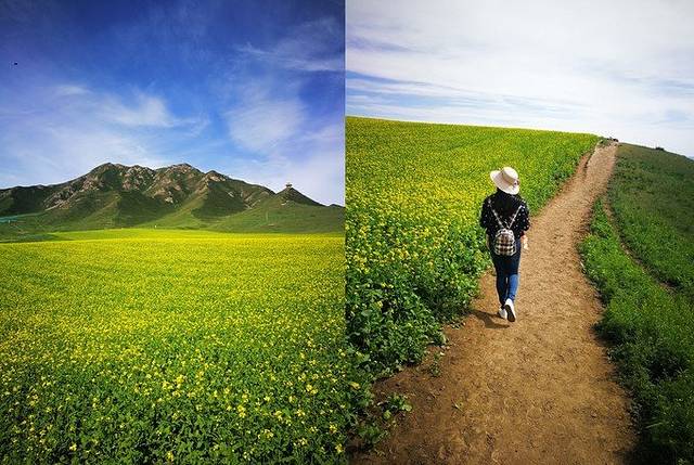 虽然已经在沿途看了无数次油菜花田了,但是去了门源你才知道什么是油菜花海,真的超!级!大!而且它因为种的时间的差异,让门源是这片开完了那片开,于是就形成了黄色和绿色交织的模样,但是比较遗憾的是我们去之前是雨刚刚停,天还没有放晴,所以那种阳光下的大片耀眼的黄色没有体会到,但是颜色带来的鲜亮感却丝毫不少,如果你带个超大广角的专业设备,我想你的全景图一定很棒!