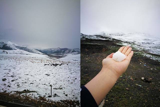 在去往门源的路上,司机告诉我们,我们非常幸运,因为昨天下雪了,于是在人间火炉的七月,短袖和白雪不期而遇,景色超美,绿色的山峰和白雪,有一种抹茶蛋糕上撒着椰蓉的感觉,特别清凉,超兴奋又很与众不同的体验!