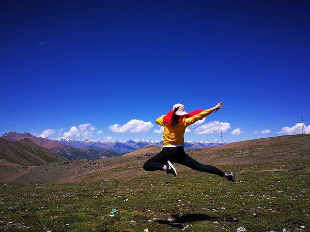 大冬树山垭口,海拔4120米的地方,如果你在这个地方向我一样撒欢的蹦,可能会稍微有些心脏紧张的效果,天空蓝的发指的同时也真的能感受到来自高原的冷意,远处眺望还能看到依稀未化的雪山,空气超好,你离天空如此之近。