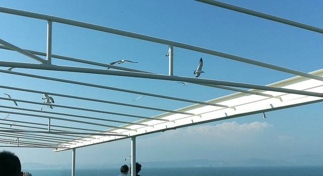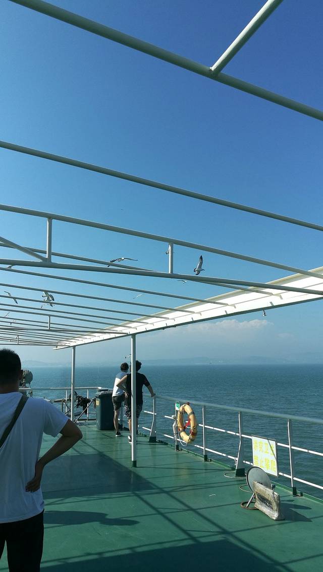 餐后开车回去退房,打车去码头,路过海鲜市场买了13元的小虾,司机师很好奇,我告诉他船上喂海鸥(船行不久,好多海鸥就开始在上空盘旋,船舱响起广播,船上有售喂食海鸥的火腿肠,欢迎大家购买。我把小虾抛向天空,发现海鸥更喜欢吃船上卖的火腿肠)。抵达蓬莱码头一问,MY GA DE,上午居然没有去砣矶岛的,最早的13:00,好嘛,那就去长岛先玩玩吧。7:30的船,很快就到达长岛。下船后随着标牌,我们被分流到散客出口,有揽客的早早地在那边等着。确定长岛最早去砣矶岛的船是13:50的之后,我把长岛行程用100元托付给了邢师傅,大致包括去九丈崖月亮湾中午渔家吃饭然后回到长岛码头,中午的渔家-土豆丝(吃得哭了,师傅直接不会炒)炸小杂鱼俩啤酒俩饮料俩米饭78元。九丈崖第三次去,纯属打发时间。