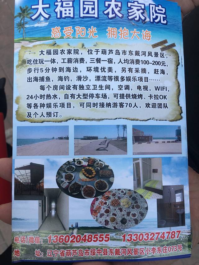 北京酷热的天气实在让人受不了,网上随便看看发现东戴河这个开发中的新海岸,决定去看看,提前订了一家农家院准备周末驱车前往,转眼到了周五,联系了农家院准备好房间,饭菜我们就出发了,北京到达东戴河大概300多公里,开车3个多小时,到达东戴河已经是晚上8点,还好大福源农家院老板很热情的款待,下车就有热饭菜,没想到晚上还能吃上新鲜的海鲜,吃完饭这个农家院有个大院,大家都坐在院子里乘凉,喝酒,还有唱歌的,很有气氛,闲来无事跟老板聊了聊周边有什么好玩的,老板很贴心看我们带着孩子,跟我们介绍好多儿童娱乐项目,还让我们早上起来看日出,抓螃蟹,因为平时上班比较累,所以吧抓螃蟹的行程放在了周日早上,挺老板说来才知道,原来东戴河周边这么多的旅游景点,还是早点睡养足精神明天好好玩吧,