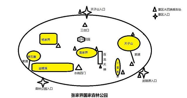 张家界的重头戏就在这个中国第一个国家森林公园了,它的名字成了这座城市的名字。从市区汽车站有直达景区大门(森林公园入口和武陵源入口)的小巴车,最早一班是早上6:00,半个小时一班,12元/人,自助投币,到达森林公园入口大约40分钟,行李办理退房的时候托运到了我们提前预定的客栈。张家界国家森林公园景区门票258元/人,包含里面的所有景点和景区内交通大巴,但是不含百龙天梯和索道费用,门票四天有效,门票可以网上购买,刷身份证自助取票。没有人能1天玩下来,最少也要玩2天,现在山里不能住宿,都要住到景区外面。景区内的大巴车都是一段一段的,到百龙天梯和索道基本是不通大巴,只能选择乘坐,不做不行,不做自己要爬山上下。全程基本不能走回头路,我们的路线是网上比较推荐的路线。可以参考下面的图示,景区有三个个主要入口,森林公园、天子山和武陵源,森林公园和武陵源入口之间可以乘小巴车到达。路线是:D1 森林公园入口—黄石寨(索道自费往返)—金鞭溪(7.5公里的步行栈道)—水绕四门(乘车处)—大巴—百龙天梯(至山顶)—大巴—袁家界—大巴——三岔口(换乘)——天子山入口(住宿),D2 天子山入口—大巴—三岔口(日出观景台)—老屋场(空中田园,需自费包车前往)—回客栈吃早餐,行李托运—天子山入口—三岔口—大巴—杨家界—大巴—天子山—贺龙公园(乘车处)—天子山索道站下山(自费)—大巴—十里画廊—大巴—武陵源入口。如果想要看日出,并且减少自费的索道项目,只能选择入住在天子山入口处,如果赶上天气好,日出还是值得一看的。大巴不一定担心坐错或者坐过站,每个乘车处都有指引人员。