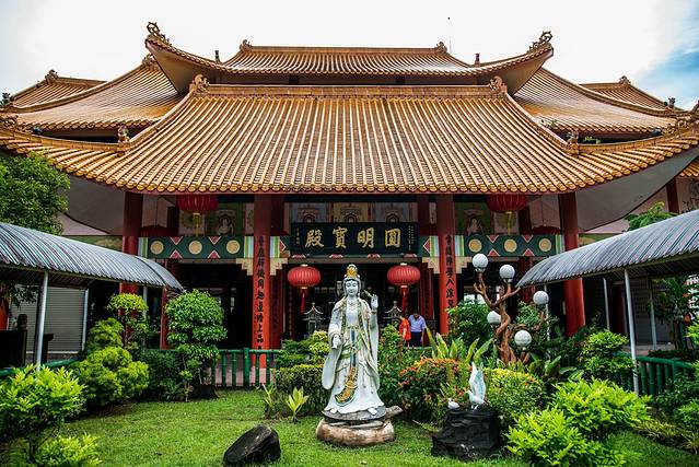 普陀寺建于1980年,位于马来西亚沙巴岛斗亚兰路尽头。寺庙袭承了中式寺院一贯的建筑风格,寺前的大门站立著包括观音菩萨在内的十座大佛像。寺院每日开放两次给佛教徒诵经。这座普陀寺是东马华人的精神家园。在异国它乡,见到中国的庙宇,实在是有亲切感。进入之后你可以看到巨大的观音菩萨立像,庙的山门前有白玉石雕塑的仙女,雕塑很有艺术水平,确实是中国仕女的形象。