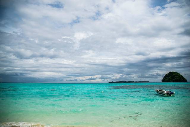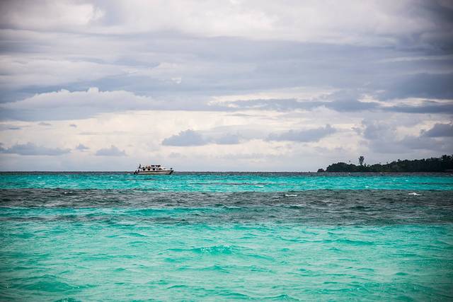 远处乌云密布,趁着太阳还没躲起来,第一次浮潜完之后我便选择回到岸上拍照,后来证明我的选择是对的,因为阴天,第二次浮潜的体验还没有第一次好,而且第二次浮潜完船回来之后也是一直阴天,没拍到照片的人都很后悔。