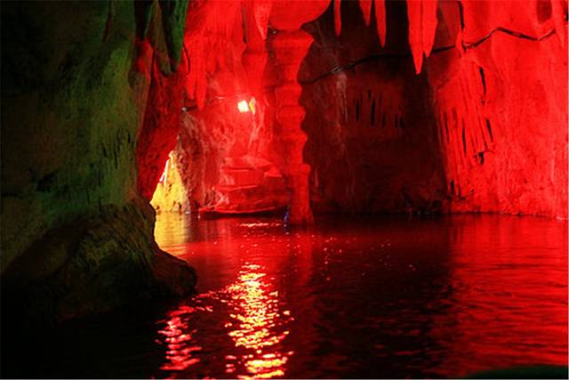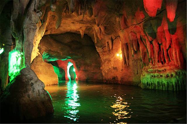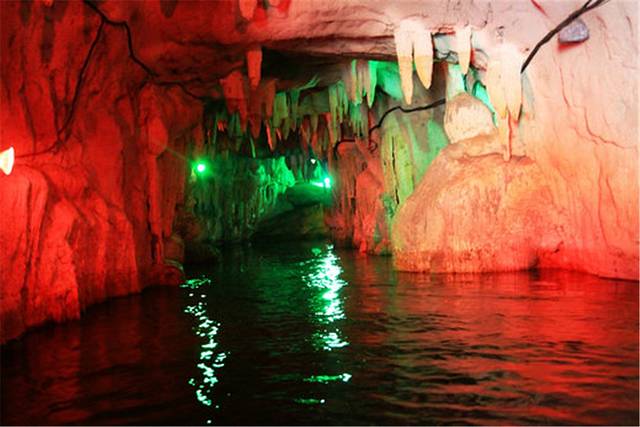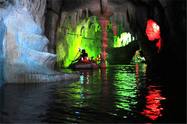 溶洞内各种石笋、石柱和石钟乳,在灯光下五彩斑斓,宛若仙境。在溶洞外,你可以和小伙伴肆意地泼水、玩乐;在溶洞中,欣赏美轮美奂的奇景,绝对不失为一种让人沉醉的漂流娱乐项目。