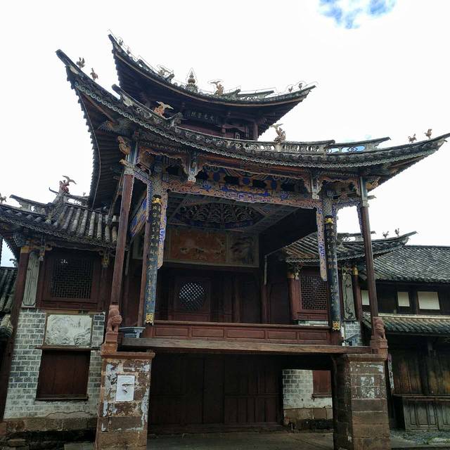 我们先沿古城内一条小街一个方向直走,先到了四方街和古戏台,周围的铺面不大却蛮有特色,能坐在古戏台对面的咖啡店看着夕阳一点一点落下,不多的游人一双一对的经过,我和他们都悠闲又惬意,也不失为生活中的乐趣。兴教寺也在古戏台对面,我是没有信仰的人,所以没敢进去游览。