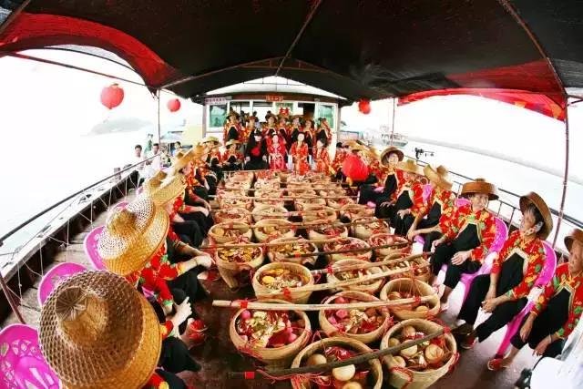 疍家婚嫁,顾名思义就是渔家人娶新娘了。其中的环节是:哭嫁,迎亲,新娘巡游,媒婆闹场,升字拜堂,渔家婚宴…