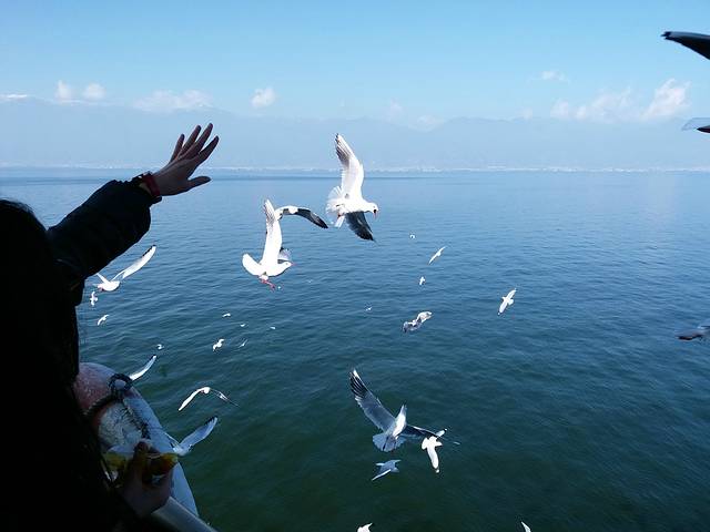 上船开船,美丽的洱海景色吸引了全船的游客,游船上空的海鸥,争抢着游客抛给他们的美食。