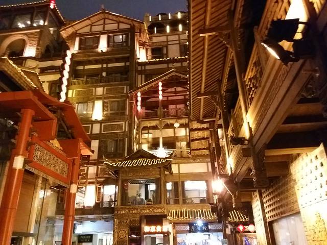 再往洪崖洞走,中途找厕所去了重庆一个小商品批发中心,顺手买了个保温杯,以方便一路上有热水可以喝,到了洪崖洞才知道需要乘坐电梯才能下去,坐了电梯到最下面,也是很多商户,但独特的景色还是感觉很有看头,因为是晚上去的,灯光映衬下显得美轮美奂。走得实在饿了,找了家小店点了当地特色美食——水煮鱼,本没报多大希望,但味道真是非常不错。