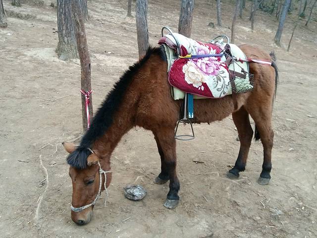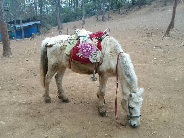 等了大概五分钟,面包车就到了,上车开始驶向拉市海马场,上山的途中,还飘了点轻雪,在车上司机师傅给了两付骑马时可以戴的手套,并且告诉在马场不要到室内去喝茶,容易被宰。并约定返程的时候提前打电话约车。到了以后上马往山上走,路途很崎岖,听牵马的大哥说,主要是让游客体会一下当年茶马古道的感觉。我们虽然没有驮着大堆的货物,也没有旁边就是悬崖峭壁的险道,但也感受到了当年远途运货的艰辛。