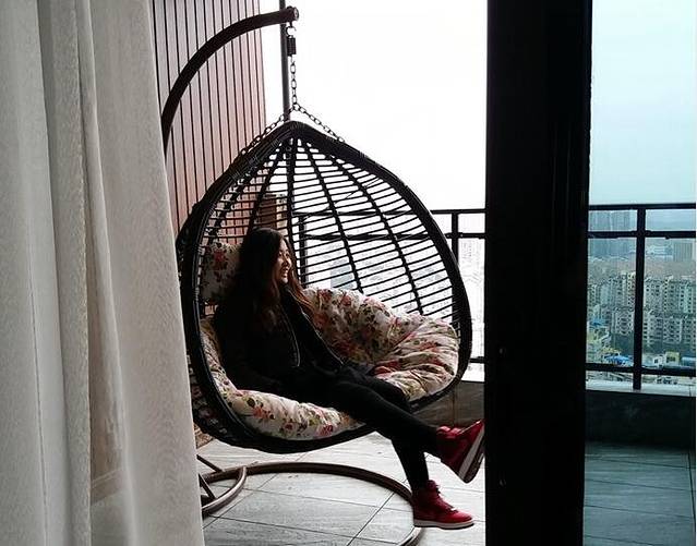 猪小妹很喜欢这个观景阳台,坐在上面傻笑。