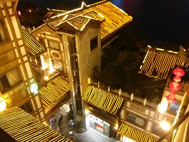 洪崖洪从上往下,看着人不多,坐电梯要排很久队才能下去。