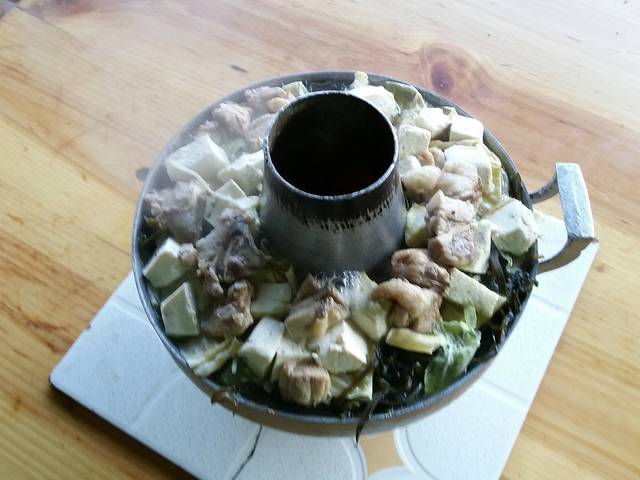 这就是传说的土鸡锅,里面有鸡、豆腐、白菜、海带、土豆,吃着清淡而暖和。