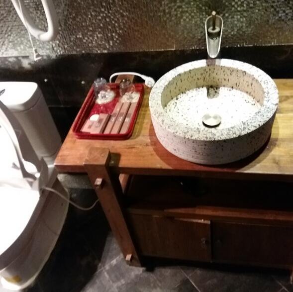 卫生间,很有特点,马桶是电动的,洗漱柜是实木的,手盆是石头的,吹风和其它用品一应具全。