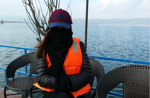全副武装的猪小妹,鱼排上很冷,风也不小。