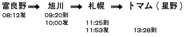 富良野到星野在地图上很近,可是路线却不直通,一定要回头到札幌再从札幌过去,这一路走了前几天的回头路,过程看起来也是比较繁琐,好在这次在富良野站不过提着箱子过天桥了,列车进站就是在检票的这一方。这期间列车到达旭川站还有一个插曲,就是某人的书包放在头顶的架子上忘记拿了,好在刚下了列车就想起来,赶紧找列车员帮忙取下,虚惊一场,所以说人品守恒无处不在,早上刚历经一场灾难,这次是免过一劫,如果书包丢了再回头找不知道会怎么打乱我们的计划~