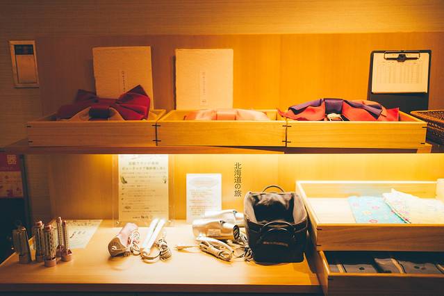 各种颜色的和服,还要卷发棒等,真的是太齐全了,只要自己拿了之后在旁边的册子上登记一下房间就可以了~
