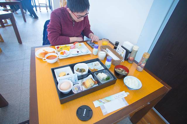 餐厅有两个,一个是日式席地而坐的,另外就是到第二天你们可以看到靠窗的有桌椅的,当时日式座位这里一个人都没有,只有我们两个,其他人都在外面另一个餐厅吃,虽然有点孤单,倒是也自在