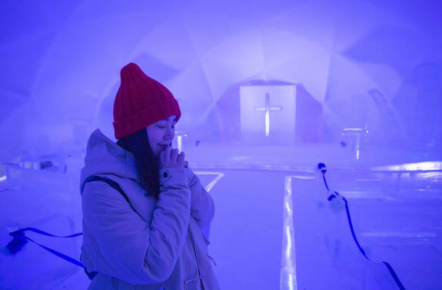 时间开始转的快了,在水の教堂一番许愿后,我们挪步又回到了爱斯冰城,等待冰の教堂的开放,之前看大家说的非常冷要注意保暖,-18℃的低温,我不得不贴了几片暖宝宝,某人还吓的穿了两件羽绒服,结果???感觉比屋外还热,因为不透风,真的,所以千万不要买什么军大衣,哈哈哈