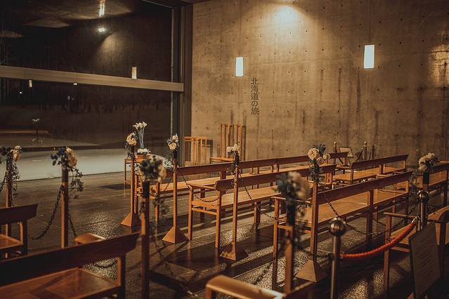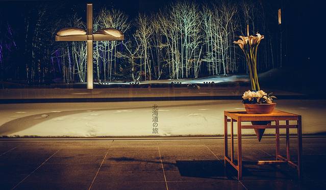 终于在不停地刷手机过程中熬到了7点,水之教堂揭开了它神秘的面纱(下图是参观完教堂内部我们没有直接出去,抹黑沿着身后的围墙踏着雪转到教堂前面拍的,困难程度3颗星,相比早上翻楼梯还是容易些,而且我们是第一个沿着围墙走过来拍照的,后来很多人跟过来,毕竟好不容易来一次,不留个正面照怎么行)