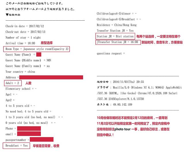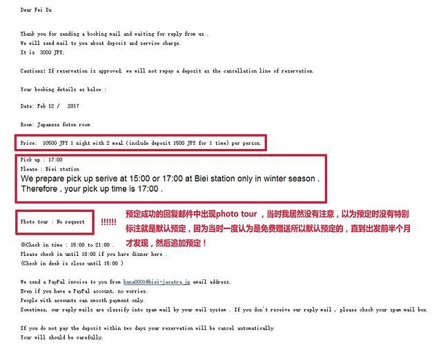 订房中第二困难的就是美瑛的民宿,在好友的游记中找到了民宿的网页链接http://www.biei-jacatra.jp/english,需要填写信息然后提交,会收到 Jacatra 先生发来的确认邮件,其实从找到订房网页后我就拜托了一位懂日语的朋友帮我订房间,收到邮件后他转发给我我自己确认回复,期间的经过时比想象的麻烦一些,开始朋友用日语选项居然没订成功后来改用英语,然后收到 Jacatra 先生的第一封来信,是确定房型,日期人数,接站时间,确定好以后回复并且注册paypal支付3000日元定金,支付成功之后Jacatra会发来预定订单成功的信息,并且询问晚餐方案,回复的时候因为看见好像没有标注预定photo tour的事情,所以再次发去邮件确认,一来一回经历三四个往复才安心把房间真正的定好。其中有三件事情要特别注意,这时候又体现我唠叨体质的特性了,因为之前看其他人非常轻松的对预定的事情描述比较少,直到笨笨的自己遇上才发现那么多笨笨的问题,即使冒着被嘲笑的危险,我还是要说明一下: