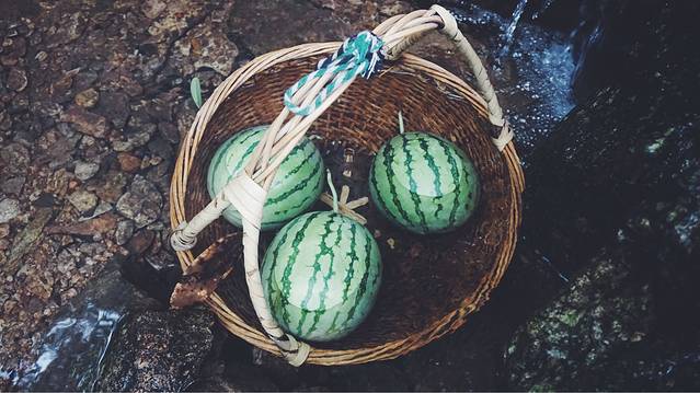 这里也是我很喜欢的一个景点。碧绿的山,碧绿的水,还有当地人民浸泡在泉水里碧绿的西瓜……爱不释手地拍拍拍……大自然真是鬼斧神工!泉水真的很清澈很凉快,真想在这大峡谷中多住几日……