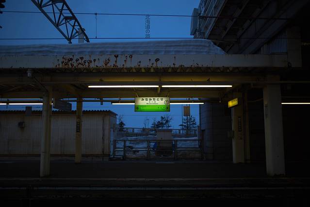 列车停的两个小时,没有空调,又心急,热的我一身汗,终于,在天暗下来之前车子启动了,到达南千岁的时候天已经黑了,心已经完全凉了。等待转车的列车早就不是计划中的那班了,再次查询,发现竟然讽刺的是钏路后一班出发的车次,所以说殊途同归,早起3个小时,多花5000日元,早早地放弃别馆的VIP待遇换来的就是这样的结局,这一天,我的心情是灰色!