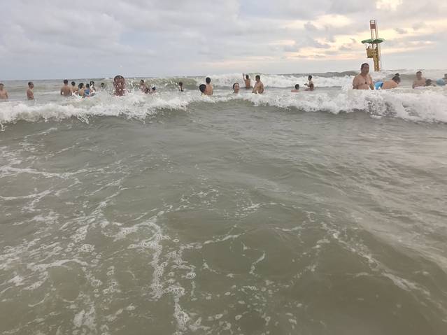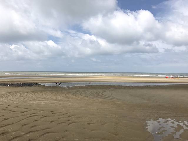 我们4人两大两小从天津出发8点55的飞机成人1150儿童1100飞北海福成机场,这个季节出行一定要做好晚点的准备,应该下午1点到,结果下午3点才到,不过幸运的是正是因为飞机晚点我们到北海赶上了蓝天白云的好天气,下了机场头几天就已经从携程上订了接机的车用完卷花了30左右,到达银滩对面的明都酒店,住的套房一张1.5的大床,两张1.2的小床我们两大两小,入住后迅速换好泳装直奔传说中的银滩,在路上买了两个泳圈10元一个,几个沙滩玩具好像是15,银滩不收门票钱哦,随便进出,但是可以想象到有多少人了。 当天晚上就在旁边的美食广场吃的烤生蚝,扇贝,螺,鱿鱼,粉,糖水四个人花了215,以前只吃芝士生蚝的我,当天吃了好些蒜蓉生蚝,新鲜的味道就是不一样啊