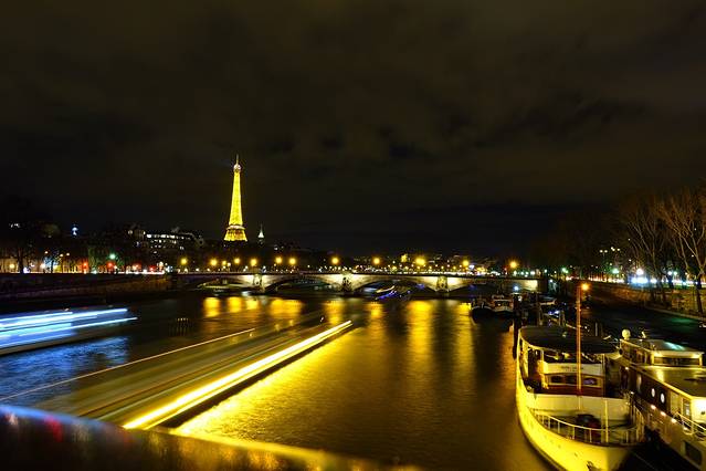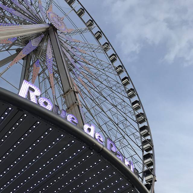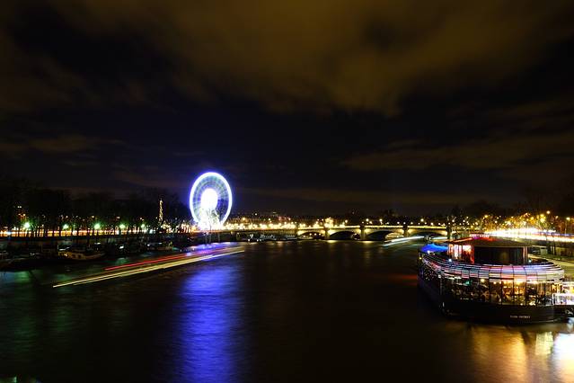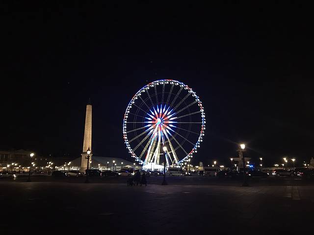 此时,天空中划过的一道轨迹,就像巴黎的浪漫之箭,正中摩天轮靶心。过不了一会儿,华灯初上,摩天轮亮起了彩灯,带着幸福的游客转着一圈又一圈。巴黎开始释放她夜的魅力。