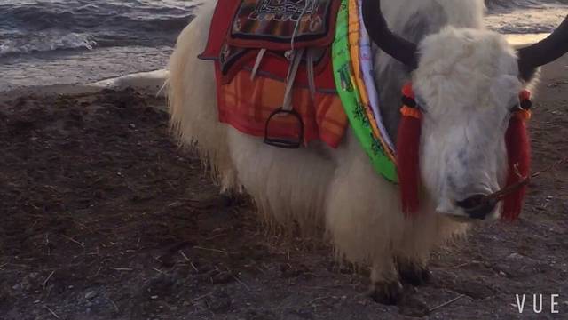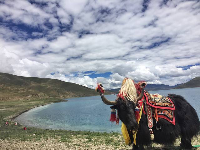 天空、湖水、牦牛,天景合一。席慕蓉说过:天是这么蓝,草是这么绿,生活本来可以如此简单和美丽。