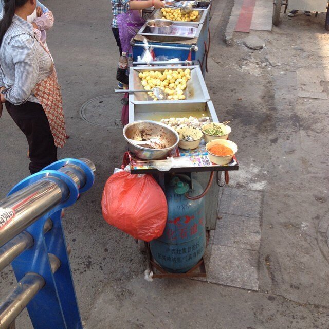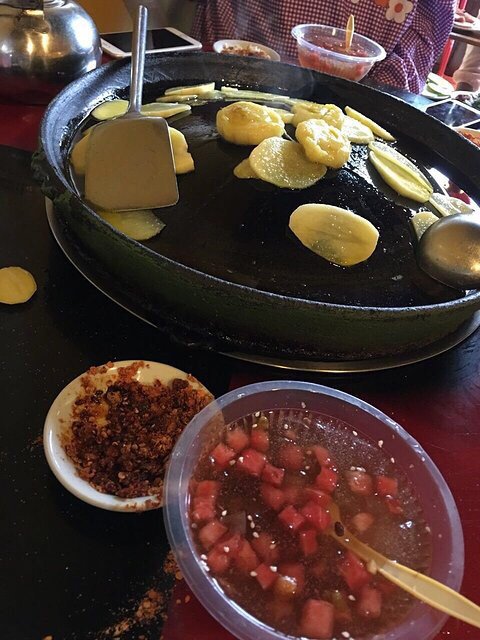 六盘水特别有名的 老城里面的一条街 全部都是特色 叫 烙锅 土豆特别好吃 沾着辣椒面 各种东西都能放在上面 用菜油一炸 回味无穷 配上冰粉 绝了!