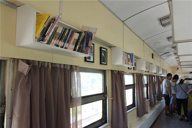 那时候的火车是绿皮车,所以一节绿皮车厢也伫立在香雪广场。不过已经变为书吧,文艺志气更浓。走进入是摆满书籍的书架,还有一个冰淇淋站点。读着书,看着冰淇淋,夏日也悠闲清凉下来。