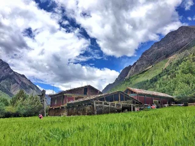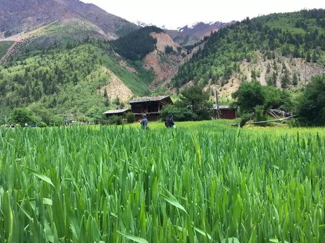 米堆冰川脚下的藏族人家,藏族人家院子里种着大片的青稞田。