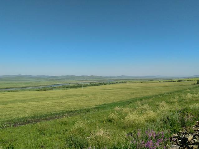 原计划想直接室韦,服务员说七卡、九卡景色特别好,临时调整线路,早晨吃完早餐往七卡方向,恩和到七卡从地图上看有点绕远,路是沙石路但沿途漫山遍野的麦田和油菜花田是最漂亮的,油菜花黄的娇艳,黄的招摇,果断下车一通拍照,路再破点也值了。接着奔向八卡、九卡,左边就是中俄界河额尔古纳河随行,右侧是麦田,油菜花,白桦林交相辉映,对岸俄罗斯小镇就在不远处,路是极美极美的,大家一定要走走看。