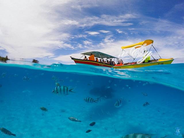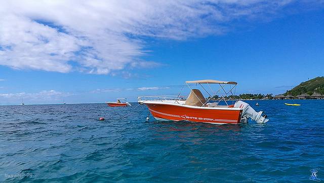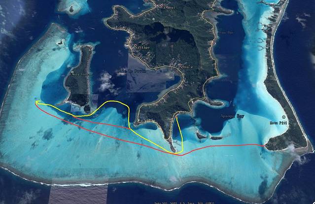先来到就近索菲特私人岛Sofitel Bora Bora Private Island背后的珊瑚花园,一群船在那里停着,很好找。如何有效抛锚是个问题,没法在岸边实践。不管那么多啦,离珊瑚尽量停近点,先飞再玩