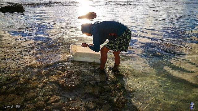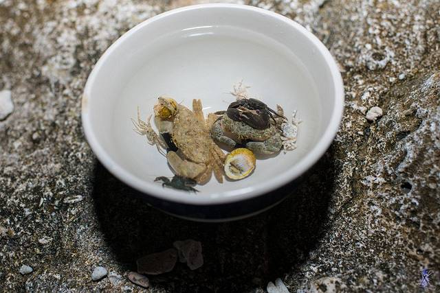 不一会儿,捉到各式各样螃蟹半碗,拍照后放归,顺便用海水把碗帮尼古拉斯洗干净了
