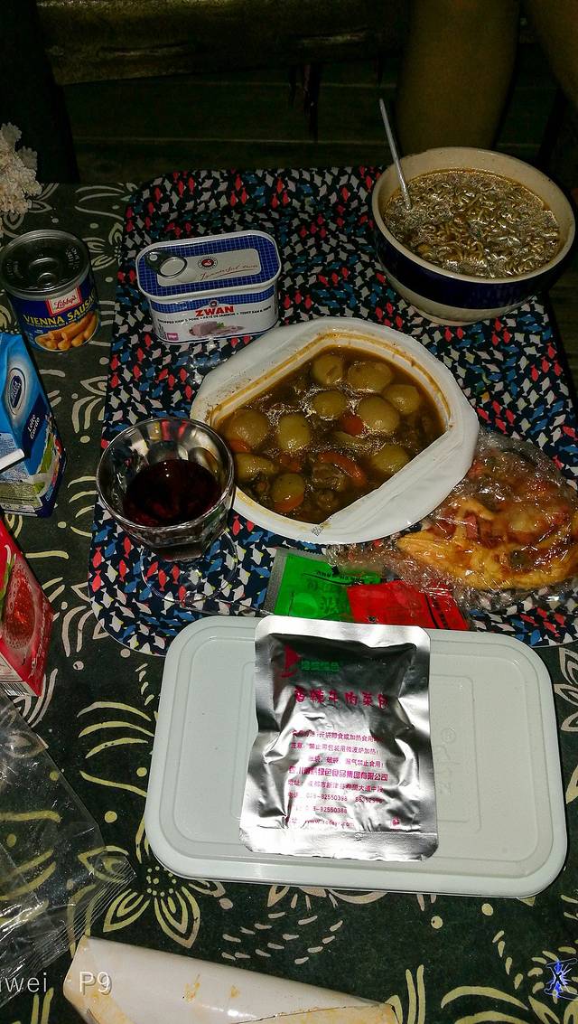 他提供了一个大碗,并一一把这些方便饭面+土豆烧牛肉+披萨+火腿肠罐头+红酒+果汁处理好,送至我们屋外