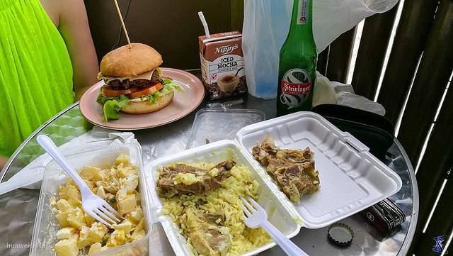 11点过,在Arutanga码头右边的外卖处,一份咖喱羊排饭,一份牛肉大汉堡,冰摩卡+冰啤酒(写游记时才发现这啤酒在纽航上随便喝,不该买嘿嘿),加上在那家彩色超市买的土豆沙拉,味道不错,价廉物美。