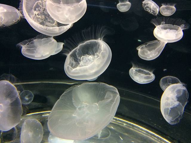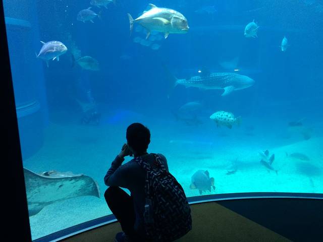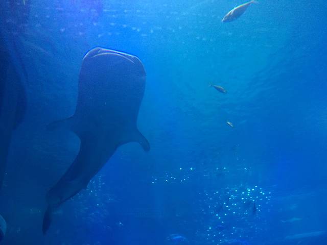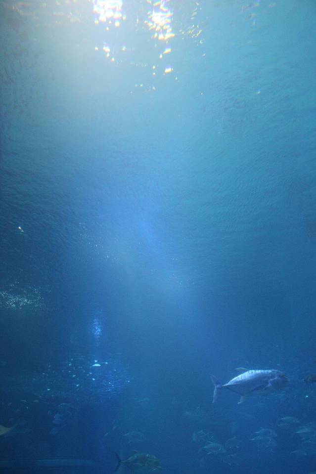 海游馆的外面挂着一整“串”海底动物,像鸟儿一样在空中飘荡。从海游馆层层走下来,时不时也有在空中游荡的错觉,海洋和天空有着同样的宽广,区别是深蓝和浅蓝不同的亮度吧。