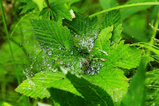 下了一上午的小雨仿佛欢迎我们的到来而停歇了,树叶和野花上都还挂着雨滴,蜘蛛的家里也进了水,一滴滴晶莹剔透的雨珠粘在蜘蛛网上,好像一颗颗天使的眼泪,只是可怜了蜘蛛要一点点清理自己的家。