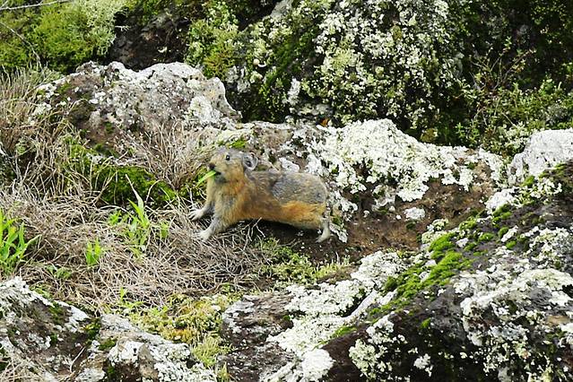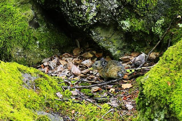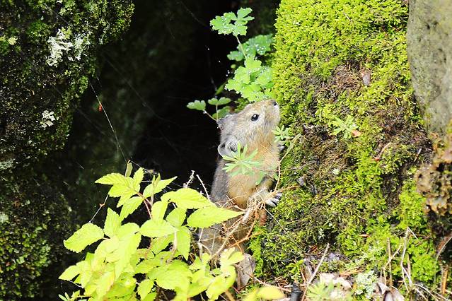 没走几步又见到一只卖呆儿的火山鼠,仔细观察了一下,火山鼠毛色不统一,背部为暗棕色,身体两侧为红棕色,小小的嘴巴似兔子呈三瓣,嘴的两边长有长须,耳前侧长有棕黄色长毛掩住耳孔,四肢短小,身体滚圆,长这样的“矮粗胖”却越看越让人喜爱。