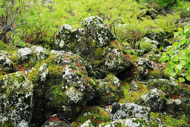 火山鼠就生长在龙门石寨的这些看上去黑乎乎的大石头中,它们把自己的窝选在两块玄武岩的缝隙里,玄武岩经几十万年的风化侵蚀,被地衣苔藓所覆盖,而这些各种各样的苔草,正是火山鼠的美食。只见碧绿的青苔装点着玄黑色的块状熔岩,树上落下来的红色松针点缀其间,仿若一幅彩色的画卷。