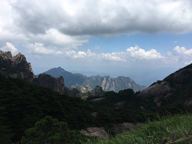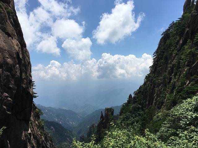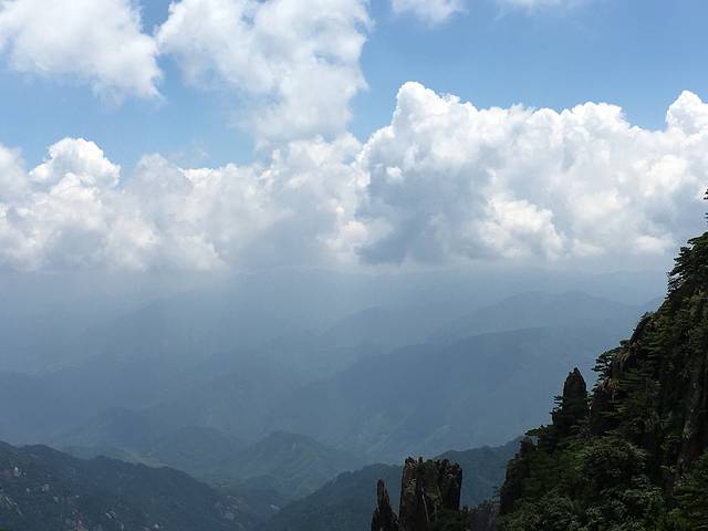 一大早6点出发,坐大巴换乘索道再经过四个小时徒步,终于到达光明顶,亲身领略了一下什么是五岳归来不看山,黄山归来不看岳的情景……蓝天白云映衬着绿荫叠翠,站在山顶领略一览众山小的磅礴,先前那四个小时的辛苦荡然无存了,深深感叹从北京这么远来到这里不虚此行……