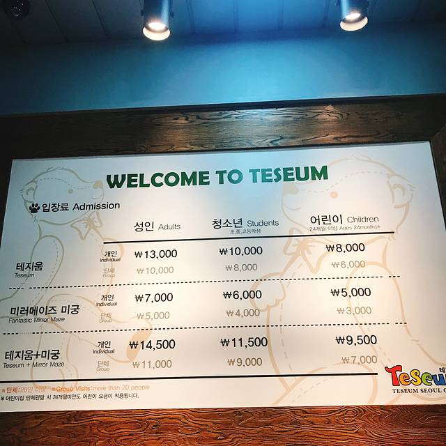 营业时间是上午11:00到晚上7:00,成人票15,000 (20岁以上),青少年13,500,儿童12,000韩元。