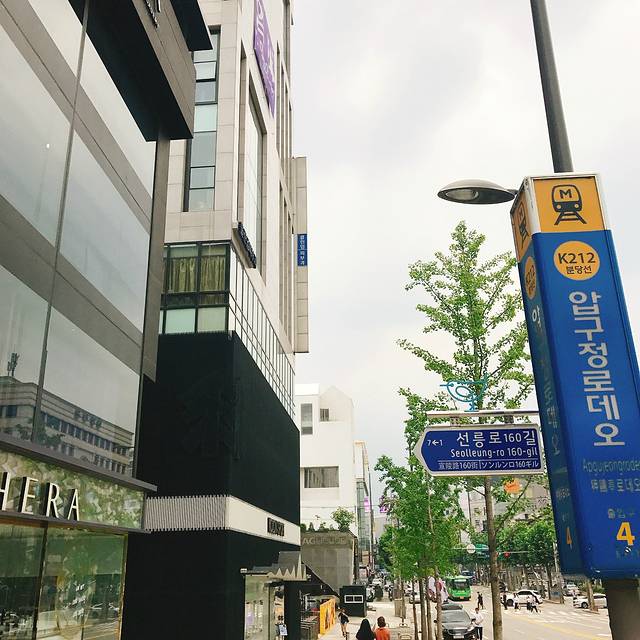 说起这个狎(xiá)鸥亭,简单介绍下,得名于朝鲜世祖的军师韩明浍的号。狎鸥亭一带发展成首尔市其中一个著名购物区,以售卖高级消费品为主,大部份为欧美、日本进口品牌,并成为韩国时装潮流的指标,很多奢侈品牌都在这一带有独立都的门面,是独立的一栋小楼哦,而且模样也都特别独特,估计能扯上什么设计师什么知名建筑师的噱头。总之不像中低端化妆品牌的店面一样在明洞开得到处都是。